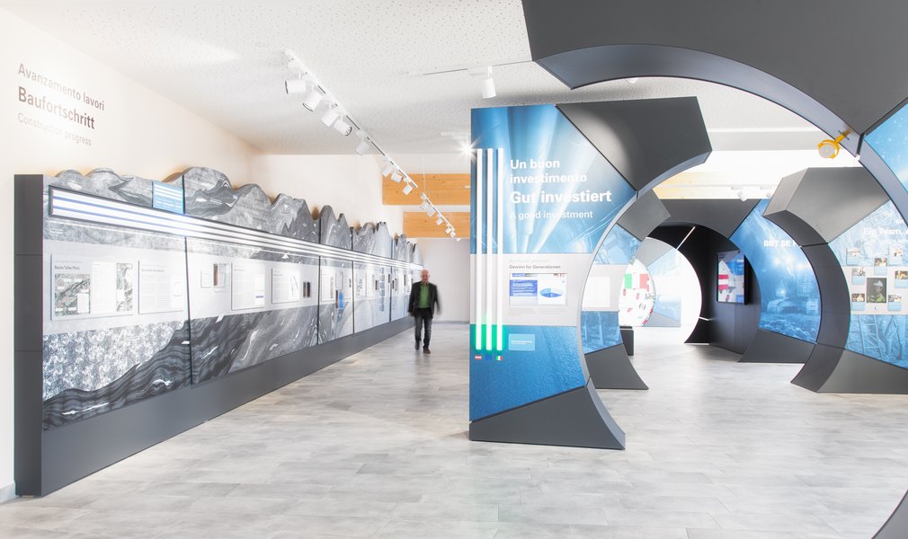Spread over two floors, the roughly 800 square meters of the Tunnel World exhibition display the largest tunnel project in Europe and offer exciting glimpses of the underground world of the Alps.