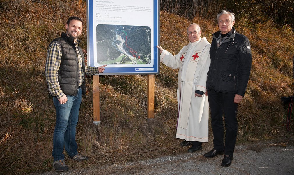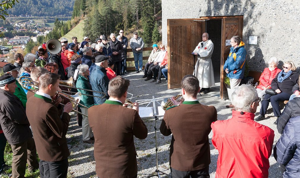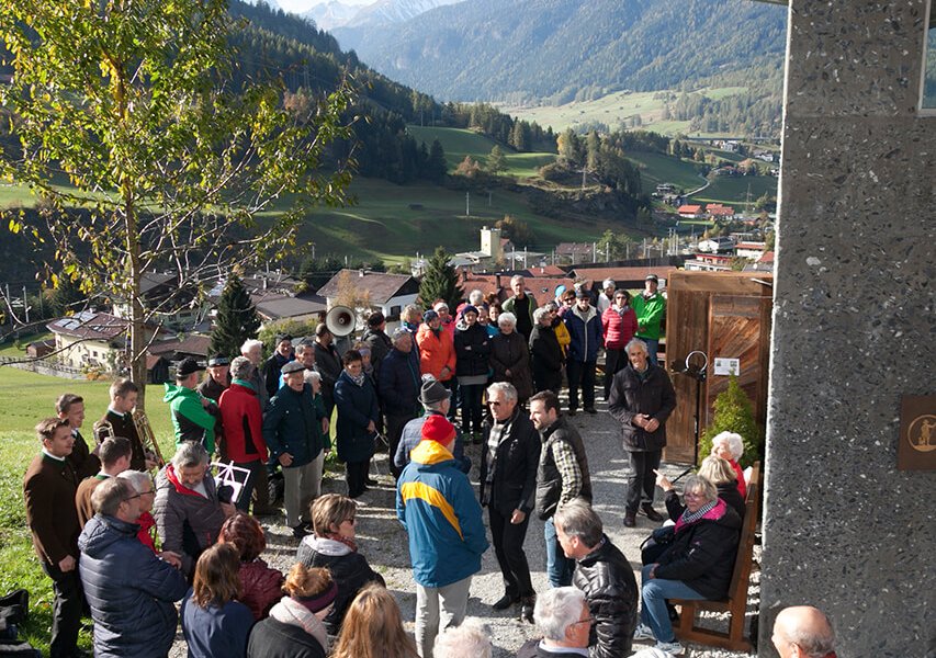 On Saturday, October 22nd 2016, the new walking trail in the Padaster valley (in Wolf, part of the township of Steinach am Brenner) was opened. Rev. Cons. Albert Moser blessed the trail as part of the atmospheric ceremony to celebrate the one-year anniversary of the inauguration of the chapel of St. Wendelin in Siegreith. The horns section of the Steinach town band provided the musical accompaniment to the ceremony.