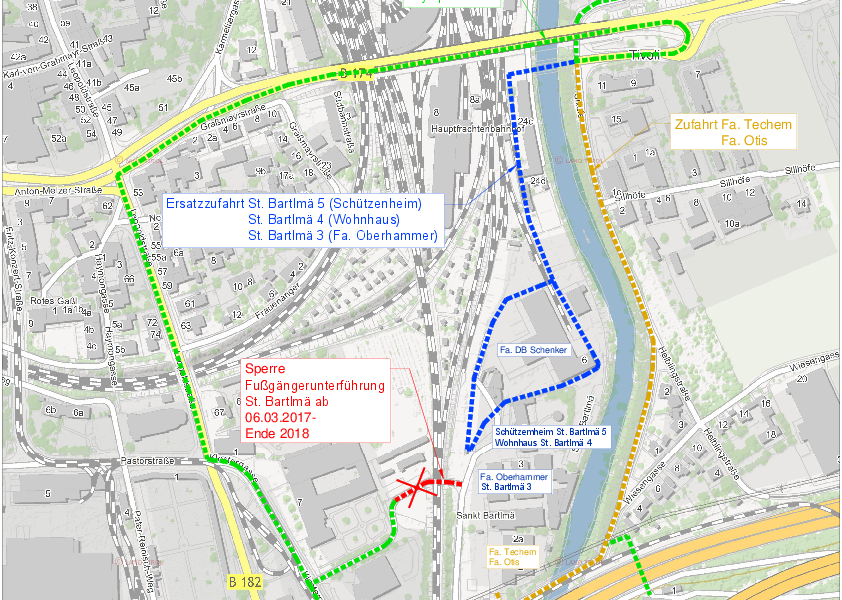 For the company premises of the company Oberhammer Maschinefabrik GmbH (St. Bartlmä 3), and the residential buildings Schützenheim St. Bartlmä 5 and St. Bartlmä 4, until 30/7/2017 the access is possible using the alternative route through the company premises of the company Schenker & CO AG.