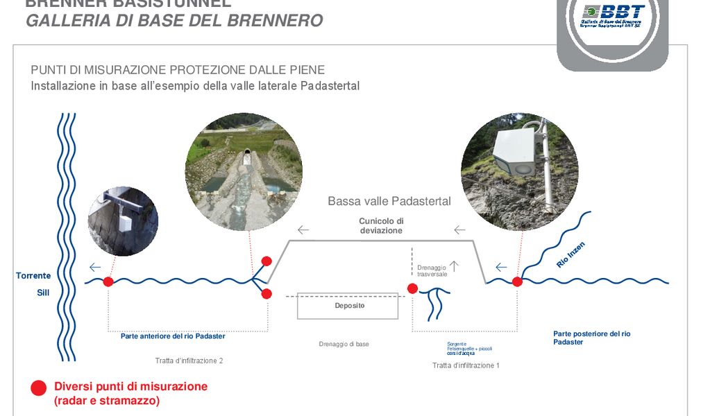 I progressi ottenuti nella previsione delle inondazioni si basano su una cooperazione interdisciplinare e sullo scambio di conoscenze idrogeologiche. I dati necessari sul bilancio idrico provengono da indagini effettuate nei decenni passati per la realizzazione della Galleria di base del Brennero. L'accento è stato posto sulla quantificazione dei deflussi sotterranei. In questo modo, è anche possibile registrare quanta acqua durante le forti precipitazioni affluisce verso le acque di falda e ipogee in profondità e quanta affluisce verso i corsi d'acqua superficiali, che sono maggiormente responsabili delle inondazioni.