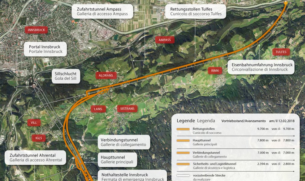 Im Baulos Tulfes-Pfons werden insgesamt 42 Tunnelkilometer ausgebrochen; 15 Kilometer davon im Erkundungsstollen von Ahrental Richtung Pfons mittels maschinellem Vortrieb.