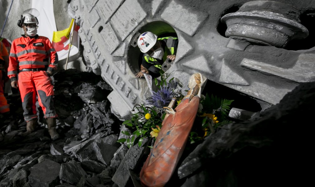 Die vom Innsbrucker Diözesanbischof Hermann Glettler eigens geweihte Statue der Hl. Barbara wurde von den Tunnelbauern stolz durch die neu entstandene Öffnung gereicht.