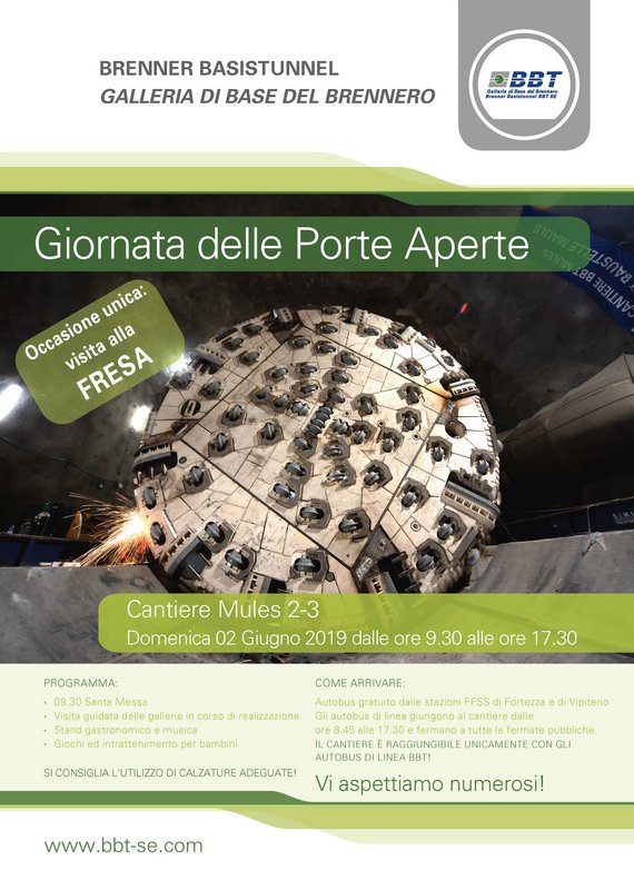 Am Sonntag, den 02. Juni organisiert die BBT SE den alljährlichen „Tag des offenen Tunnels“. Dieses Jahr findet der Tag des offenen Tunnels auf der BBT-Baustelle „Mauls“ bei Freienfeld statt. Die Baustelle wird für alle Interessierten geöffnet sein und kann von 9:30 Uhr bis 17:30 Uhr besucht werden.