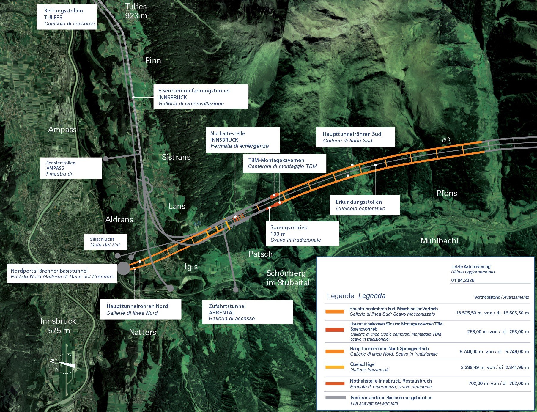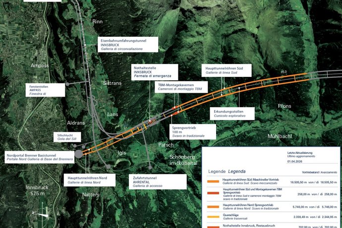 Der maschinelle Vortrieb startete im Jahr 2023. Am 2. Mai machte sich die TBM Lilia im Haupttunnel Ost auf ihre 8.108 m lange Reise. Am 27. Juni wurde die TBM Ida im Haupttunnel West angedreht. Im zweiten Halbjahr 2025 haben beide Tunnelbohrmaschinen ihr Ziel erreicht.
